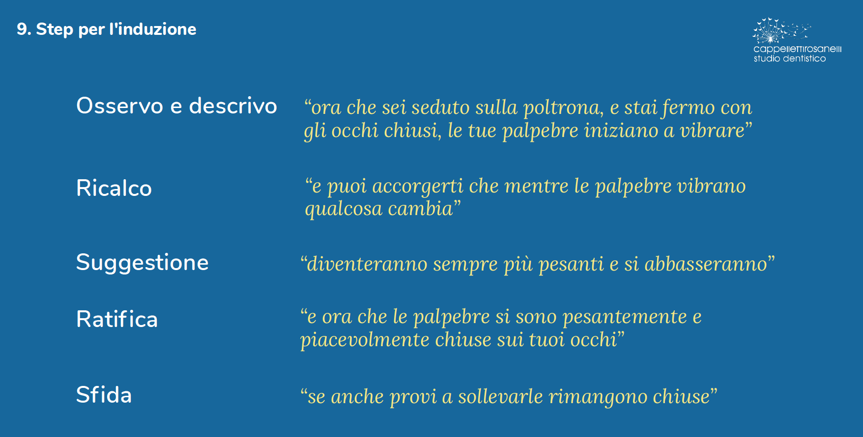 Adottando quindi il giusto linguaggio e i gusti atteggiamenti comportamentali portiamo il paziente in uno stato di benessere e pieno affidamento che in alcuni casi potremmo anche definire trance.